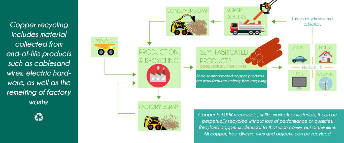 Copper can be fully recycled and reused again and again, without any loss of performance. Copper recycling and waste management have become an important part of the supply chain, keeping resources local, creating local jobs, saving on landfill site space and incentivising the recycling of other materials.
