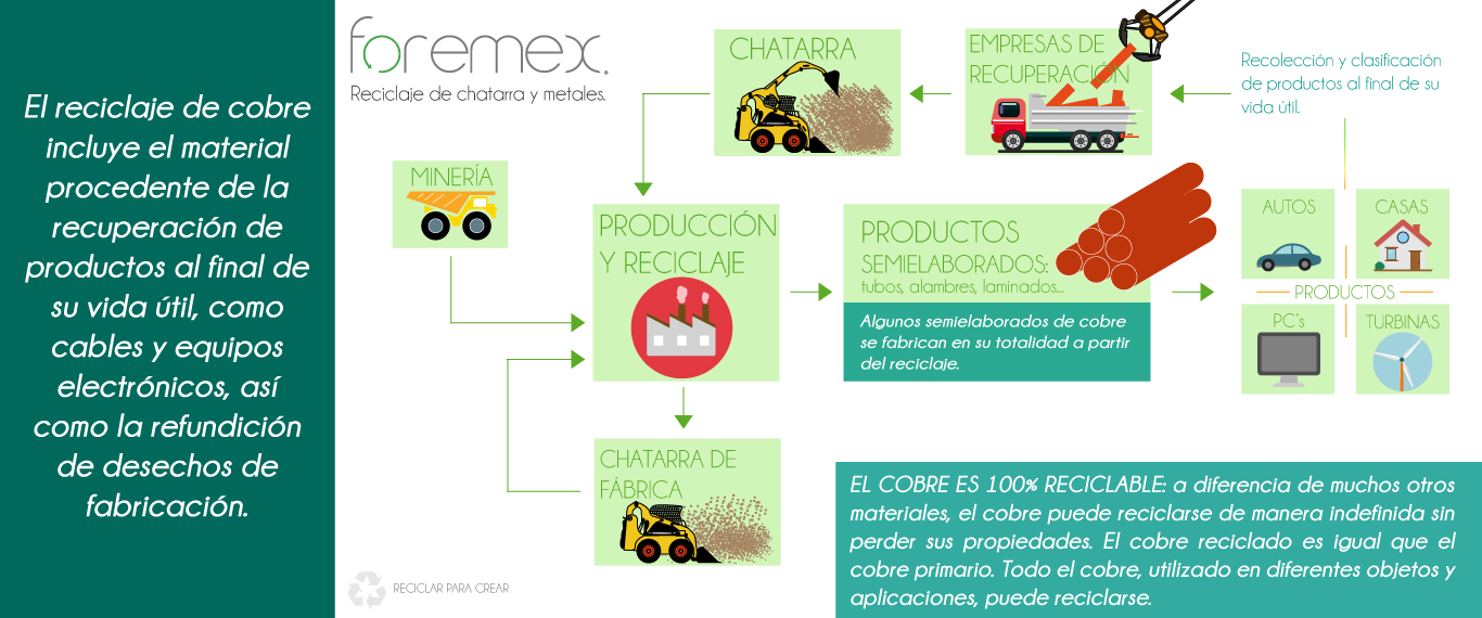 El cobre es un metal altamente reciclable, a diferencia de muchos otros materiales, el cobre puede reciclarse de manera indefinida sin perder sus propiedades. El cobre reciclado es igual que el cobre primario. Todo el cobre, utilizado en diferentes objetos y aplicaciones, puede reciclarse.