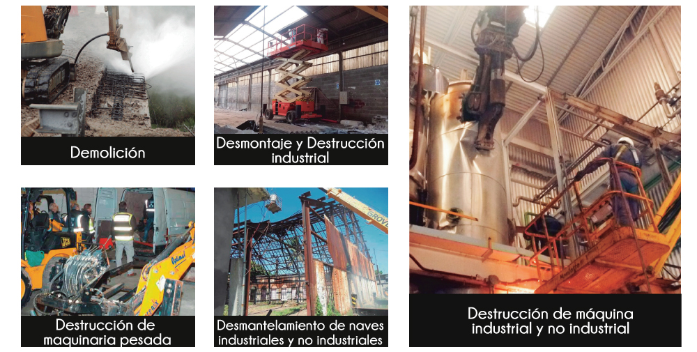Ofrecemos el servicio de demolición, destrucción de estructuras metálicas, maquinaria, equipo y desmontajes industriales, así como el retiro y logística de la chatarra que se generen en estas actividades, diseñando un plan de reciclaje totalmente a la medida de sus necesidades. Garantizamos la correcta disposición de todos los materiales obtenidos y/o resultantes de la destrucción o desmontaje. Para realizar estos trabajos, transportamos a nuestras instalaciones dichos residuos, los cuales son pesados y posteriormente pagados según el valor de los mismos.