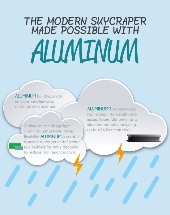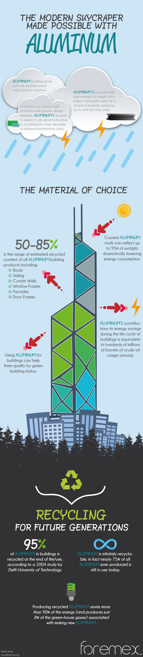 Aluminum is often referred to as a “miracle metal” and for good reason. Its long list of inherent properties—lightweight, corrosion resistant, easily formed, highly conductive, highly reflective, non-toxic, durable and recyclable—gives manufacturers and designers a wide range of options for product innovation and process improvements. By virtue of its strength and beauty, aluminum is also the backbone and facade of noteworthy buildings worldwide.