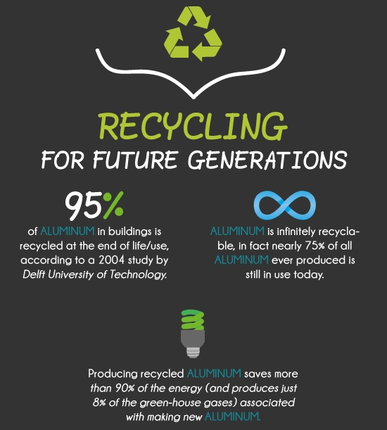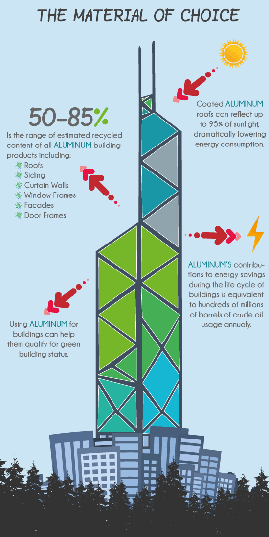 Today, aluminum is recognized as one of the most energy efficient and sustainable construction materials. Coated aluminum roofs can reflect up to 95% of sunlight, dramatically lowering energy consumption. The estimated recycled content of aluminum building materials used today is between 50 and 85 percent.